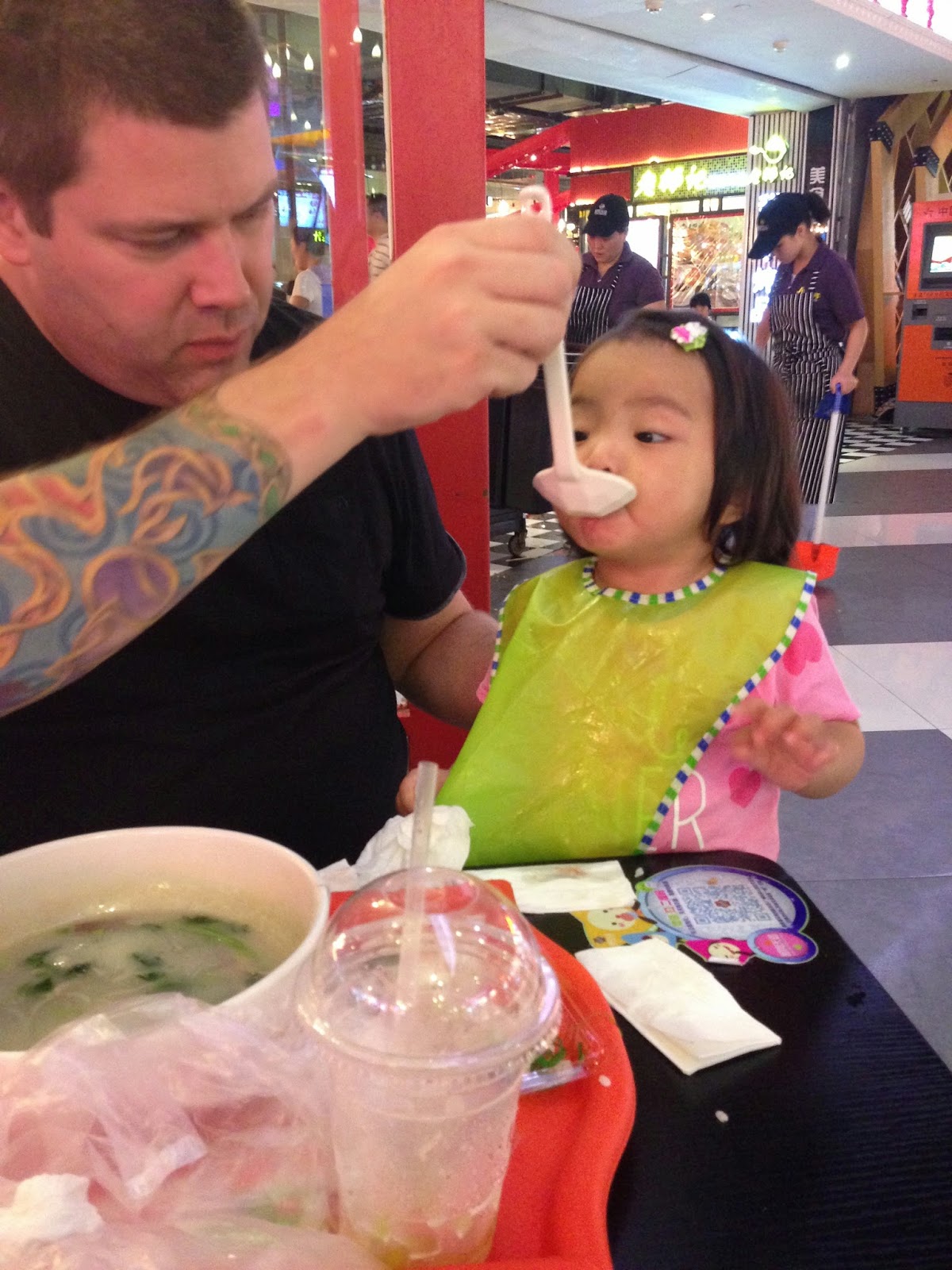 | Here she is reaching a foot over "helping" daddy fill out our entry cards for Hong Kong. |